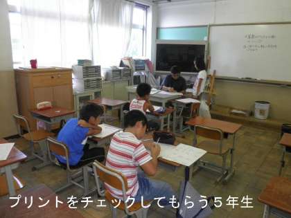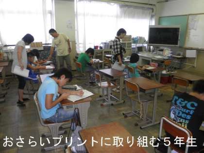 複数名の先生たちと一緒に算数や国語の問題に取り組みました。夏休み中,真面目にがんばって参加してくれたことは,学力向上だけでなく,いろいろな意味で子どもたちの成長につながると思っています。本当によくがんばってくれました。
