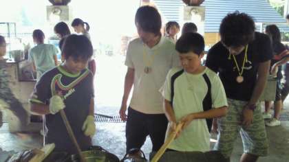 花脊山の家の第1炊飯場で,この宿泊学習初の野外炊事が始まりました。