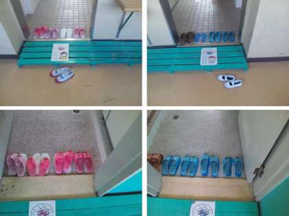 そこで,この夏休みにトイレの出入口にスリッパの置く位置をペンキで塗りはっきり分かるようにしました。すると,夏休みが終わってトイレのスリッパの様子を見ていると,きれいに整理して置けるようになってきました。この調子で,これからずっとトイレのスリッパをきれいに整理しようとする意識が子どもたちに育ってくれればいいなあと思っています。