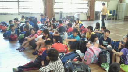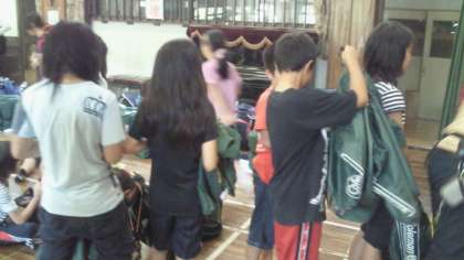 体育館に集合して,荷物を置いた後,寝袋を受け取り点検をします。