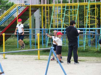 2年生はてつぼうで自分の挑戦する技を決めて,友だちと教え合いながらがんばっています。
