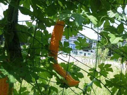 4月に種を植え,今まで育ててきたツルレイシ(ゴーヤ)やヘチマは,大きな実ができていました。