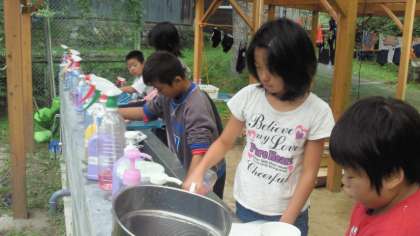 眠たそうにしている子どもたちもいますが,みんな元気に朝食の準備をしています。