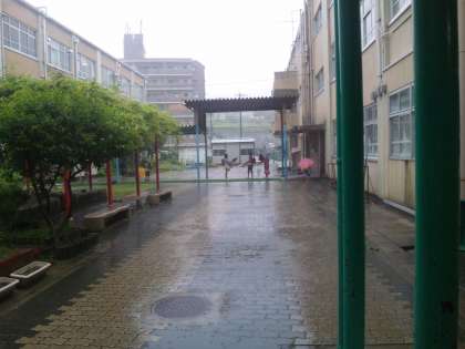 雨にぬれながらも元気に子どもたちは登校してきました。
