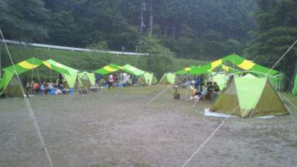 雨が降ってきたので,子どもたちは,タープテントの下で朝食をとっています。