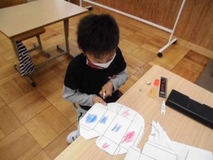 画用紙で宝箱を作りました。どのように切ったら箱の形になるのかな?工夫しながら作りました。