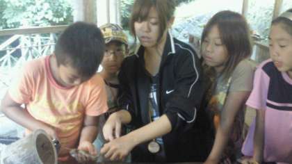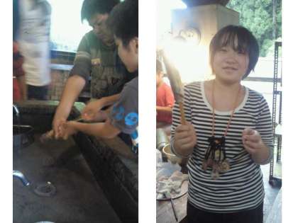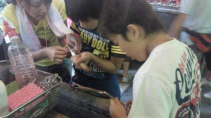 まず,アマゴの腑抜きをします。次に,腑抜きをしたアマゴを串ざしにして焼きます。アマゴは塩をまぶして,塩焼きにします。炭火でじっくりと焼きます。