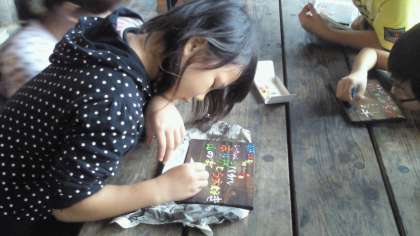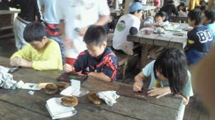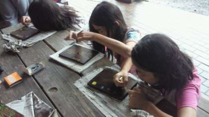 子どもたちは,この6日間の思い出を一人ひとり『焼きすぎ板』にアルスカラーを使ってかいています。