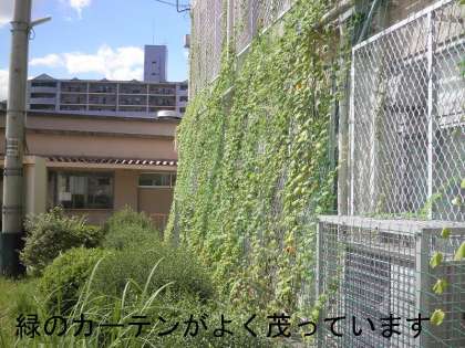 台風一過,涼しくなってきましたが,緑のカーテンが今頃になって覆い茂ってきています。特にゴーヤが職員室の南側の窓一面を覆っています。猛暑の夏休みはすき間だらけだったのですが・・・!もう少し早く覆い茂ってくれればよかったのですが,しかたないですね。これから10月ぐらいまではこのまま世話をしていきたいと思っています。