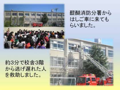2時間目の終りに「地震と火災」を想定した「避難訓練」を実施しました。今年は醍醐消防分署の方にも来ていただき,はしご車での救助訓練なども見せていただきました。