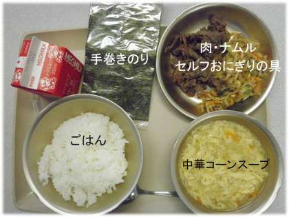 「ごはん」「中華コーンスープ」「肉・ナムル(セルフおにぎりの具)」「手巻きのり」