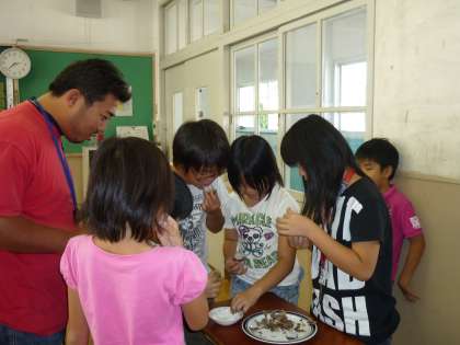 中国では,中秋節に蒸した里芋に砂糖をつけて食べます。子どもたちは,これも試食しました。日ごろよく知っている食べ物の違った食べ方に驚いていました。