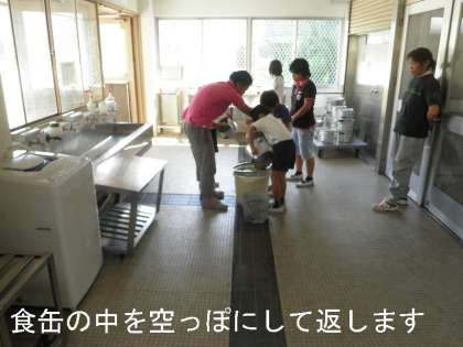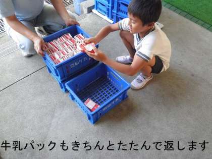 給食室に食器や食缶(おかず入れ)を返しに来た際,子どもたちは,ていねいに食缶に残ったものを残飯・残さい入れにあけています。また,牛乳パックもきちんと折りたたんでケースに並べています。
