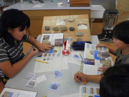 理科で「土地のつくりと変化」の学習をしています。地層のでき方や火山でできた大地など,写真や映像だけでなく,実際の化石,岩石を直接触ったりして興味を持って学習しています。