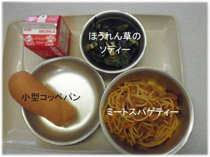 「小型コッペパン」「ミートスパゲティー」「ほうれん草のソティー」