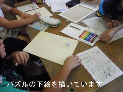 図工で板を切り抜いてパズルをつくることになりました。しっかり下絵を描いた後,線に沿って電動糸のこを使って切り抜いていきます。