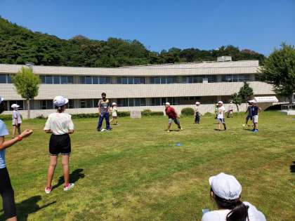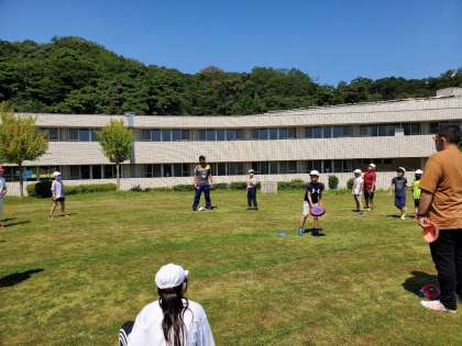 芝生広場でドッジビーを楽しんでいます。