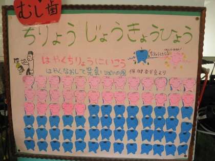 そして,保健室前には虫歯治療状況表が掲示されています。これについては,青からピンクに早く染まってほしいのですが!