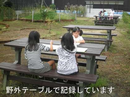 昨日の大雨で,水かさの増した池の中の生き物を探したり,見つけた生き物を野外テーブルで記録したりしました。