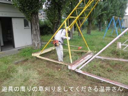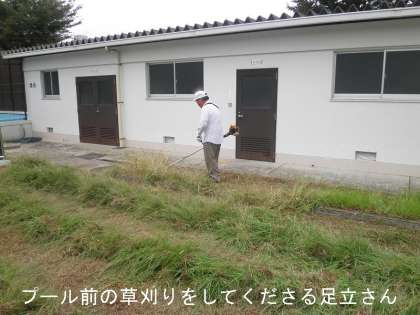 運動場では,中山団地の足立さんと温井さんのお二人が,先日に続いて草刈り作業をしていただきました。