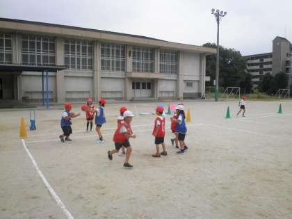 運動場では2年生が,ボール運動「パスゲーム」をしていました。ポートボールやバスケットボールにつながる運動です。