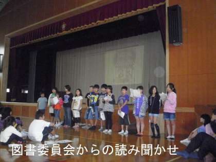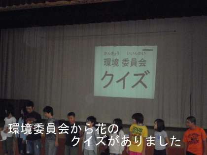 1分間スピーチの後は,各委員会からの発表です。今日は,「環境委員会」からの花の名前当てクイズ,「図書委員会」から読み聞かせ,そして「集会委員会」からは人気のあるフラッシュクイズが出ました。