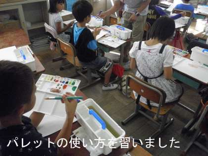 図工の時間,絵の具の使い方の学習をしました。パレットの各部屋に絵の具を出し,色の混ぜ方を練習しました。