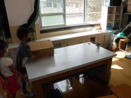 空気の力を利用した実験を見たり,空気砲を使ってろうそくの火を消したり物を飛ばしたりしました。