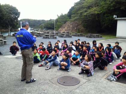 予定を変更して,『朝のつどい」を朝食後に,野外炊飯場で行いました。