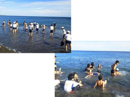 そこで,足のひざのあたりまで水につかる範囲で,海には入って波遊びを楽しむことにしました。