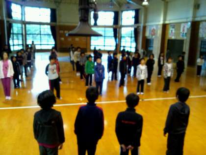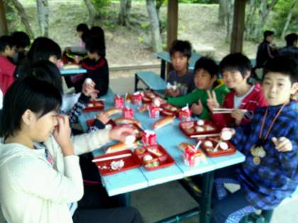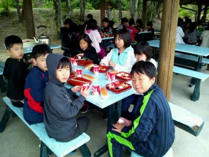 『朝の集い』はプレーホールで行い,『朝食』は屋外の『東屋』でとりました。