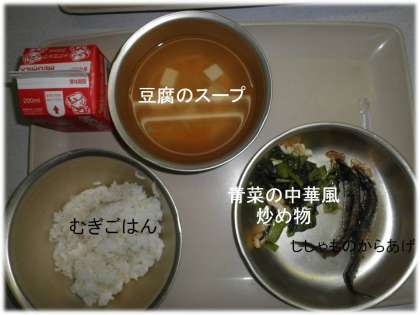 10/3は「むぎごはん」「豆腐のスープ」そして「ししゃものからあげ」と「青菜の中華風炒めもの」でした。