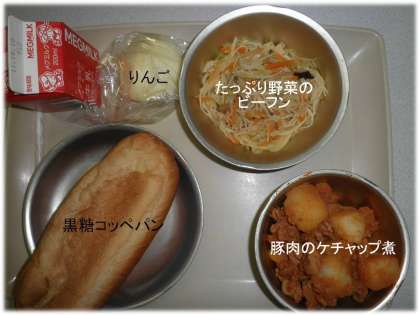 今日の給食は,「黒糖コッペパン」「豚肉のケチャップ煮」「たっぷり野菜のビーフン」そして,デザートに「リンゴ」がついていました。