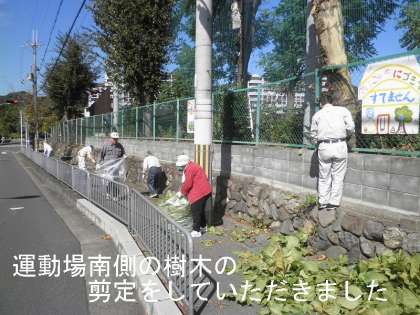 毎年,落ち葉の量が多く,歩道を通行する方に迷惑をかけています。雨の日は落ち葉で滑って危険です。ですから,毎年この時期にボランティアで剪定していただいています。