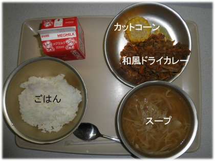 「ごはん(白米)」「スープ(もやし,玉ねぎ入り)」「カットコーン(とうもろこし)」「「和風ドライカレー」です。