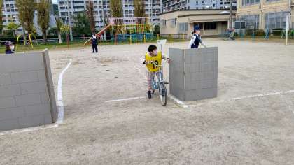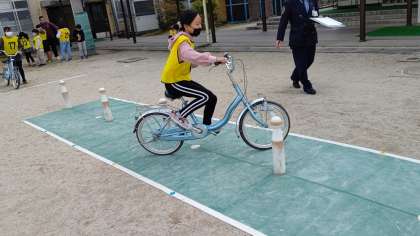 山科警察署の方に安全な自転車の乗り方についてご指導いただき,校庭に設けられた模擬の道路上を自転車で走行しました。そして,京都市行財政局サービス事業推進室の方にもご支援いただき,実技テストも行いました。