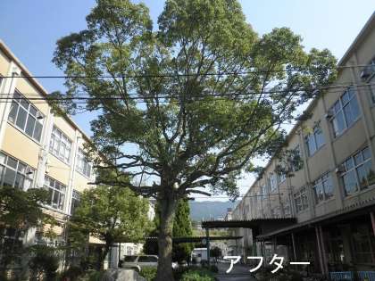 とても立派な木ですが,枝の重みで風が吹いたら折れてしまったり,子どもたちの教室に陽が入らないこともありました。また,これから落ち葉の季節ということもあり,本日,自町連の会長さんに思い切って剪定していただきました。