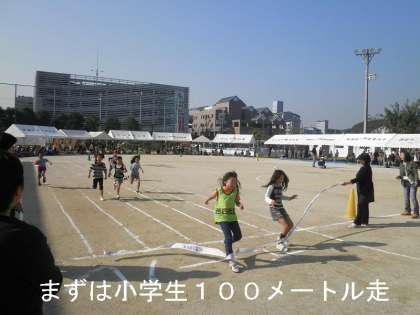 まずは小学生の100メートル走からはじまりました。学校の運動会とは違った雰囲気で,地域の方と楽しく交流しています。