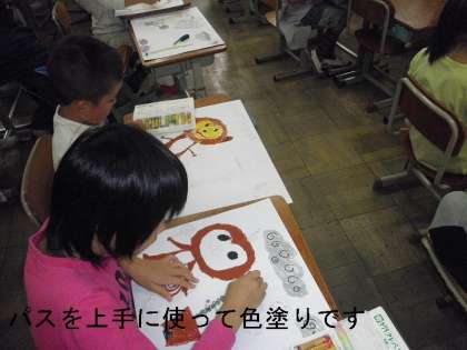図工でお話しの絵をがんばっています。先生に教えてもらって「パス」でにごらないように彩色しています。