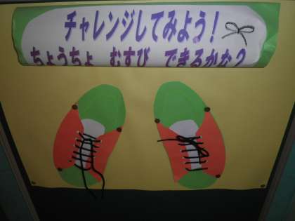 保健室前を通ると,「ちょうちょ結びに挑戦」と書かれたひも付きの靴のはり絵が掲示されています。
