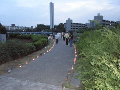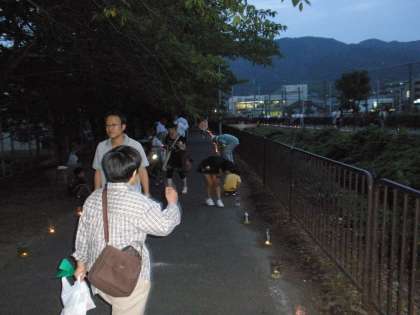 醍醐地区の子どもたちが作った約1000個の「ペットボトルとうろう」が,山科川沿いに並べられ幻想的な小路を作りました。