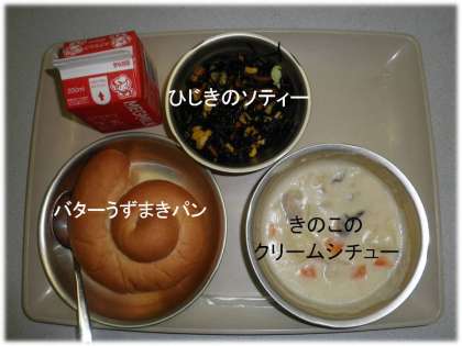 「バターうずまきパン」「きのこのクリームシチュー」「ひじきのソティー」でした。