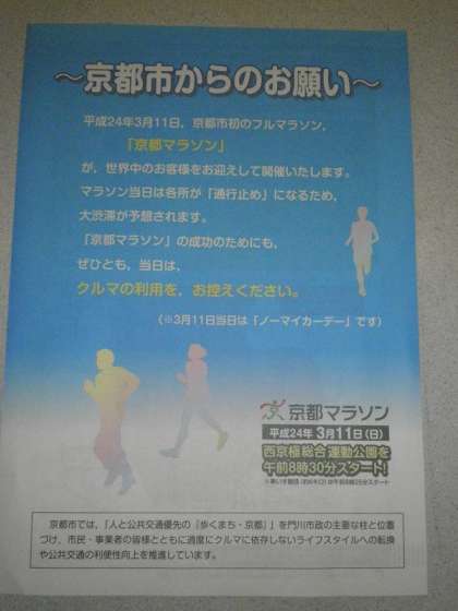 そのため,当日は各所が「通行止め」になるため,大渋滞が予想されます。「京都マラソン」の成功のためにも,クルマの利用をお控えください。