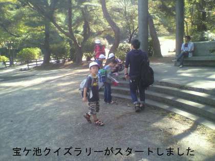 宝ケ池クイズラリーがスタートしました。ボートの数を数えたりドングリを拾ったり班で協力しています。