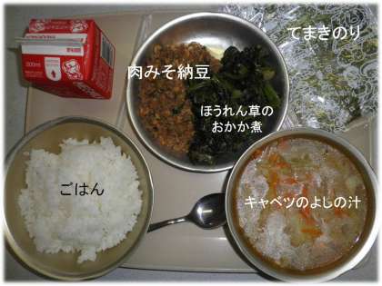「ごはん」「キャベツのよしの汁」「ほうれん草のおかか煮」「肉みそ納豆」「手巻きのり」