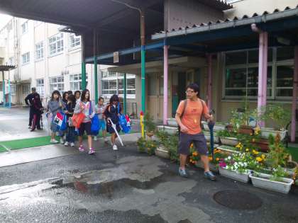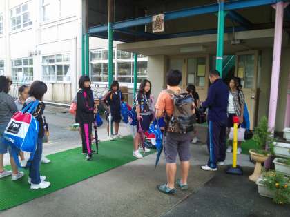 部活動のバレーボール部でがんばっている子どもたちが,朝の8時に学校に集合しました。