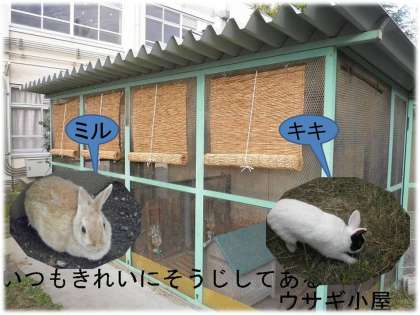 毎日,子どもたちや係りの先生がきれいにそうじをしてくれ,ウサギたちも気持ちよさそうです。今年になってから,「ミル」も「キキ」もおしっこやウンチをする場所が決まっており,そうじもしやすくなっています。