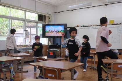 体全体を使って『秘伝ラーメン体操』をしました。体を動かすうちに,笑顔もより増えてきました。