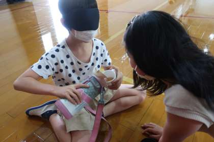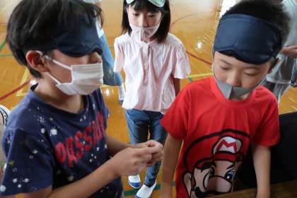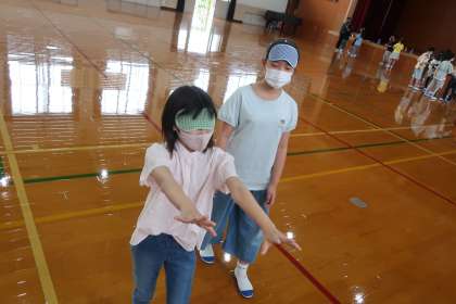 総合的な学習の時間『共に生きる〜くらしやすい街醍醐西〜』の学習です。体育館でアイマスク体験をしました。歩行する,点字にふれる,お茶を飲む等々視覚障害のある方の状態を体験するなかで,生活することの大変さを感じるとともに,介助の仕方の大変さも感じていたようです。