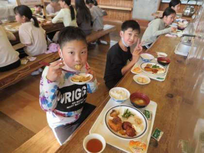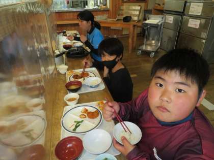 普段よりも少し早い夕食ですが,たくさん活動したのでおなかが減っています。
